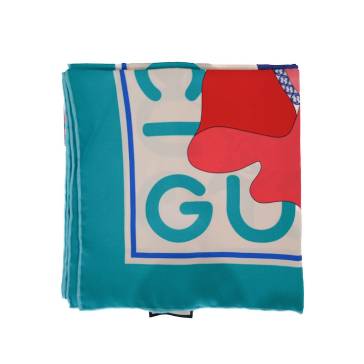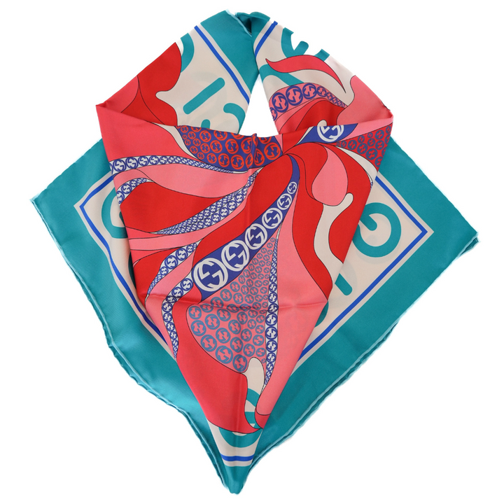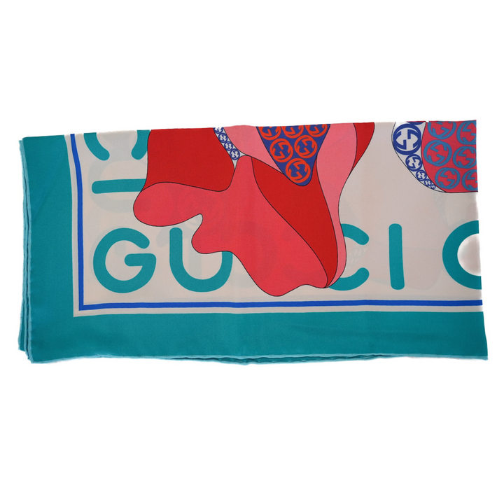 This elegant silk foulard features a stunning mix of colors, blending turquoise, ivory, coral, and pink floral patterns, with the GG interlocking logo.